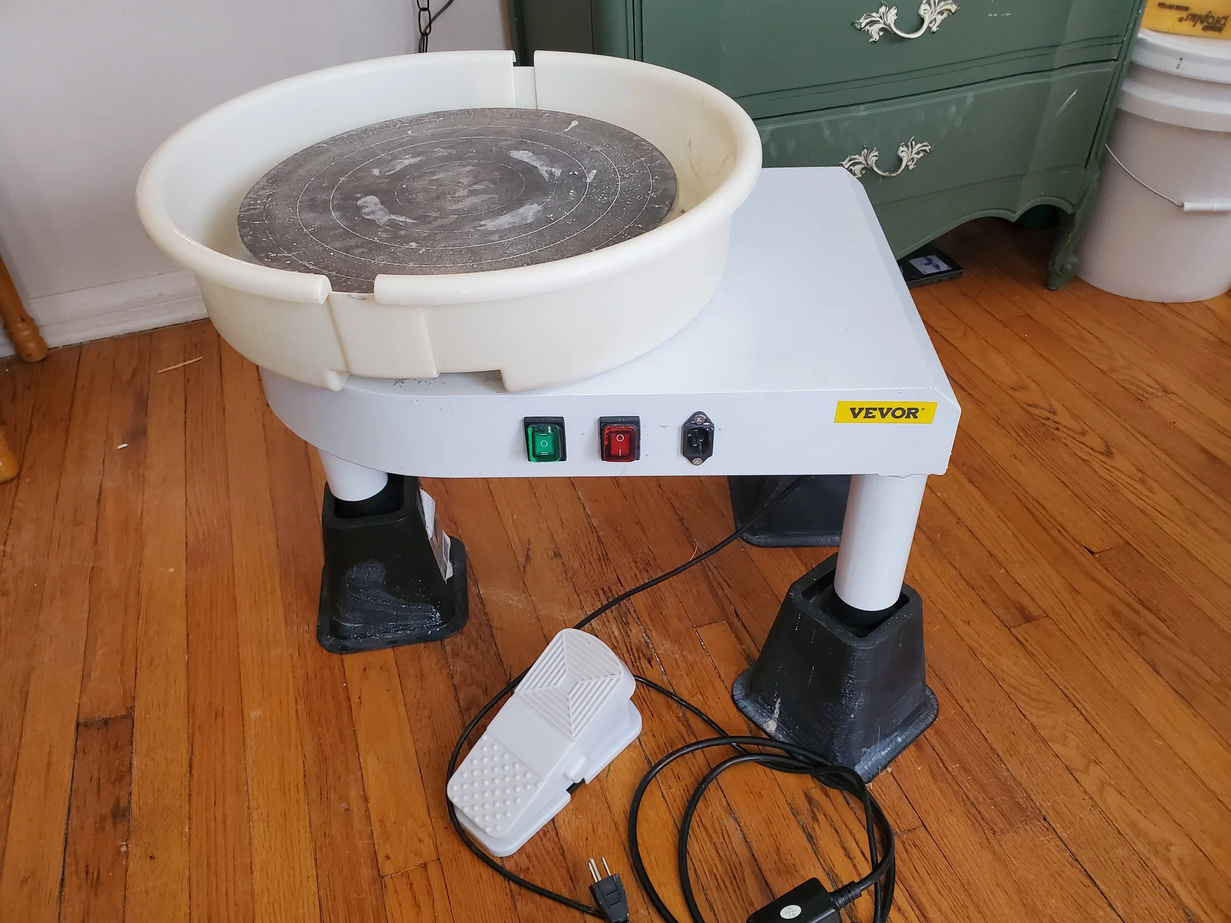 wheel throw fairly evenly, with standard plant pot size in mind (4”, 6”, 8”10”etc), leaving extra thickness at the bottom to trip and eventually warp/press the feet out (I did attached feet to a few of them, but was much happier with the results and time saved by pressing the rest)